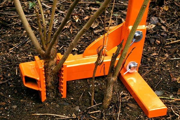 The image on the right shows the bottom-side assembly of such a tool. The wrench is composed of a slider joint that constrains the motion of two “jaws.” These jaws trap the main stem of the plant and, as the lever (handle) is pulled by the operator, they draw the plant out of the ground.